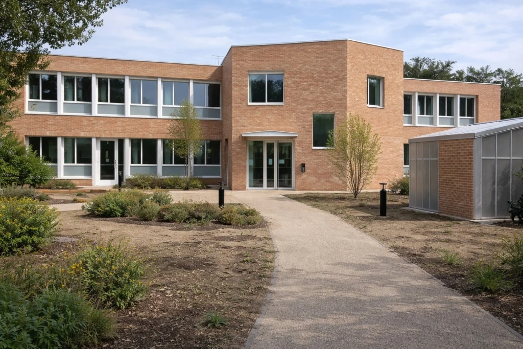 Concernant l’extérieur du bâtiment, l’ensemble des façades a été entièrement repris. L’isolation des murs et l’étanchéité ont été rénovées, puis une structure en briques a été mise en œuvre sur l’ensemble des façades.